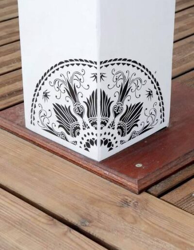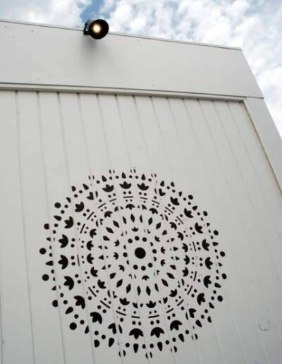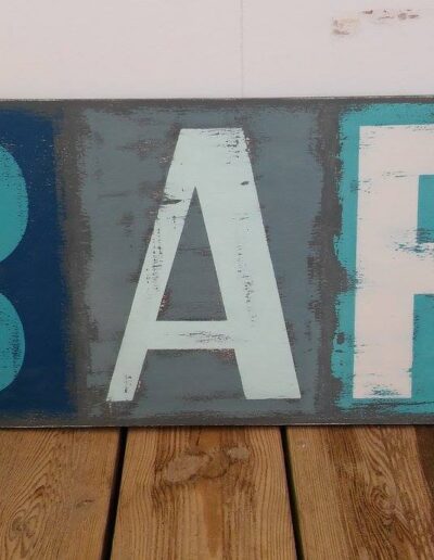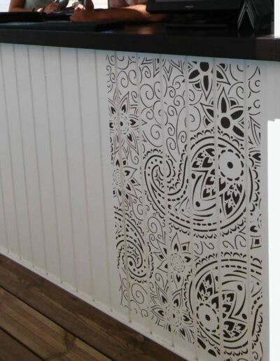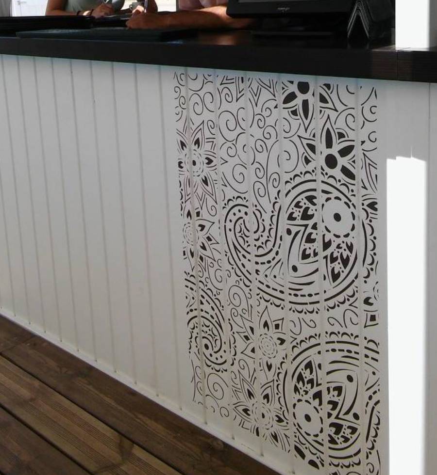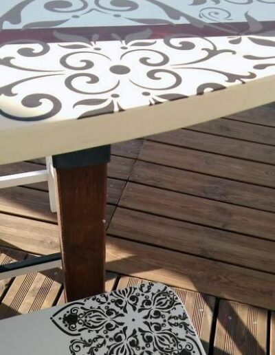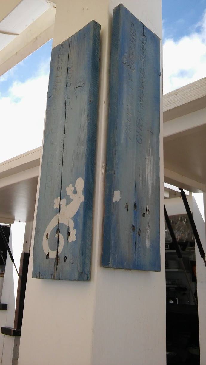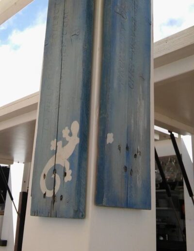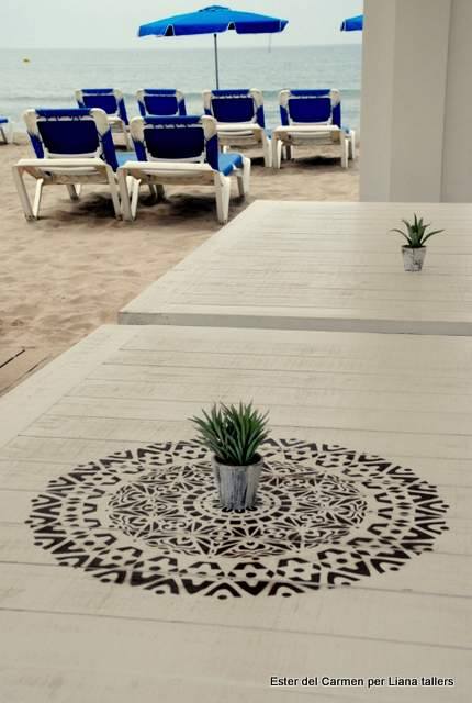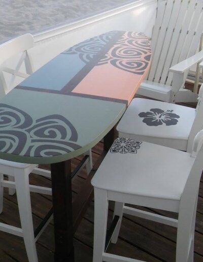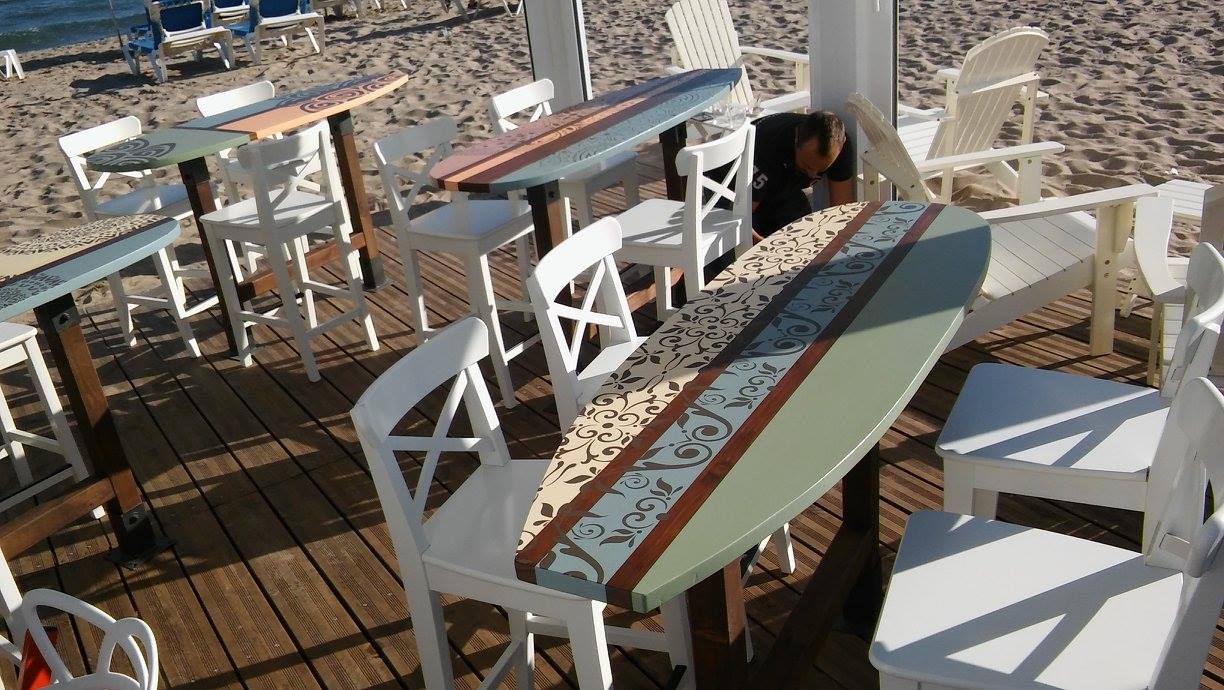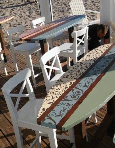 Decoració realitzada amb stencils i decoupage, construcció de taules amb planxa de surf i pintura decorativa, projecte d’il·luminació amb cabassos i planxes de surf.